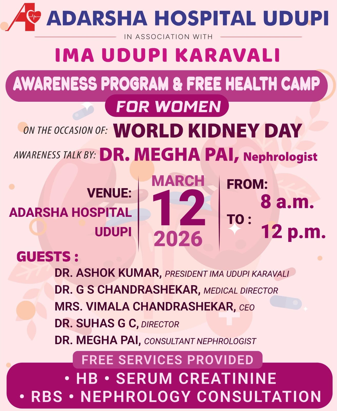 ಉಡುಪಿ ಆದರ್ಶ ಆಸ್ಪತ್ರೆ: ಮಾ. 12ರಂದು ಮಹಿಳಾ ಜಾಗೃತಿ ಮತ್ತು ಉಚಿತ ಮೂತ್ರಪಿಂಡ ಜಾಗ್ರತಿ ಶಿಬಿರ